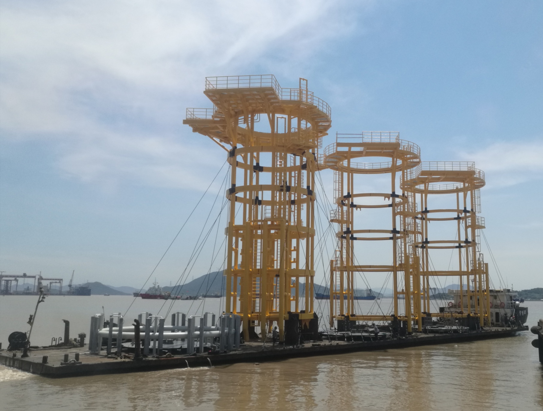 據(jù)介紹,風電套籠鋼結構是海上風電項目中風電管樁的一種保護裝置,風電套籠鋼結構主要由外平臺、內平臺、圈梁、靠泊附件、欄桿等組成。成品有兩種規(guī)格,一種總鋼量約為65噸,凈高18米;另一種總鋼量約為163噸,凈高20米。主要給船舶維修人員、工作人員進入海上深壓站提供平臺。