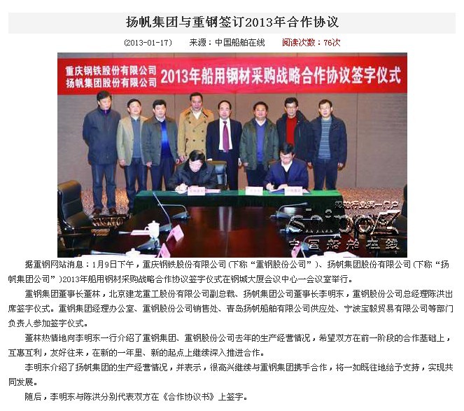中國船舶在線:揚帆集團與重鋼簽訂2013年合作協