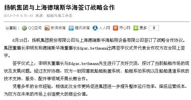 船舶與海工:揚帆集團與上海德瑞斯華海簽訂戰